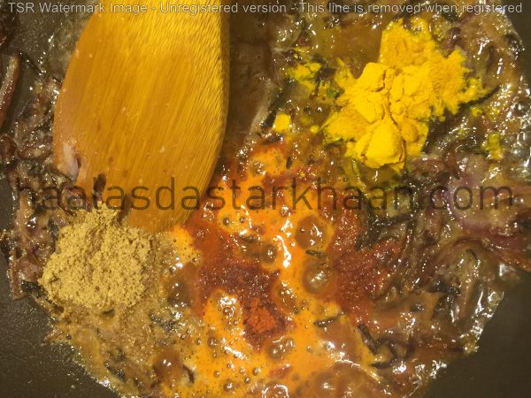 Add turmeric, salt, red chili powder and coriander powder to it. Add a little water, around ½ cup and saute till the raw smell goes away.